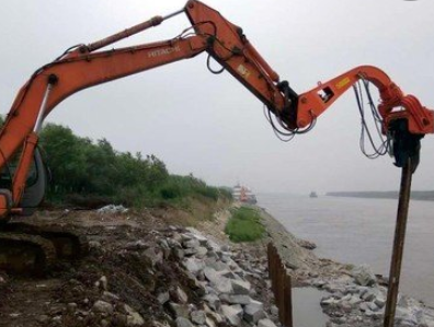 液压振动打桩机主要安装在挖掘机上使用。高频液压振动打桩机内置两只偏心轴,采液压马达驱动,产生高速旋转及垂直激振力,透过减振橡胶块后,维持一定的振幅,能够应付多种类型的土质与打桩要求。激振力是与偏心轴尺寸和振动次数平方成正比,制作的偏心轴均经过详细计算与测试,兼顾的激振力和材料特性的匹配,不但能满足工作需要,同时保证了机械可靠度